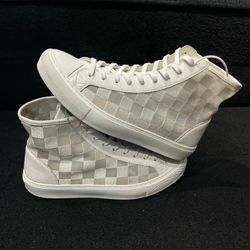 Louis Vuitton Tattoo Damier high-top sneakers in white and grey canvas with leather accents. $300Merced, CA