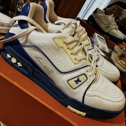 This is a Louis Vuitton Trainer Low 'Signature - White Blue' sneaker. $400Merced, CA