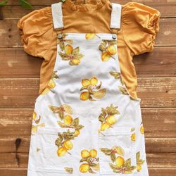 SIZE 12 GIRLS 2-PIECE OUTFIT JANIE AND JACK DARK MUSTARD PUFF SLEEVE RIBBED BLOUSE W/LEMON PRINT CHAMBRAY OVERALL DRESS$8Merced, CA