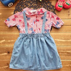 4T 2-PIECE VINTAGE OSHKOSH B'GOSH RED/WHITE/BLUE GINGHAM BOWS BUTTON-UP SHIRT W/BLUE CHAMBRAY OVERALL SKIRT$6Merced, CA