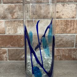Large Hand Blown Mexican Glass Cylinder Vase 1’ X 6” round Clear w/Cobalt Blue & Aqua Swirls $20San Jose, CA