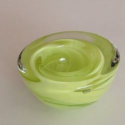 Kosta boda yellow with green hitn glass candle holder by anna ehrner. Pre-owned, very good shape, no chips or cracks. Display item. It is 2 18 tall, $28San Jose, CA