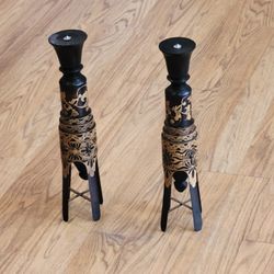 Pair of Vintage Hand Carved Indonesian Wood Art Candlesticks Candle