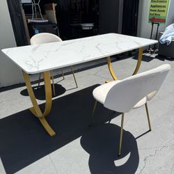 3 Piece Modern Dining Set, Faux Marble Gold Extendable Table and 2 Velvet Gold Chairs Like New $150Santa Ana, CA