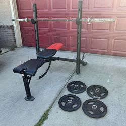 Squad rack and adjustable bench bar and weights 35 25 10$250Livingston, CA