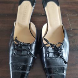 Authentic Chanel Women's Iconic CC BLACK Bow Toe Cap Kitten Mule Heels Size 39/8.5. $250 Pickup In Oakdale $250Valley Home, CA