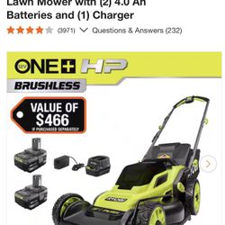 RYOBI ONE+ HP 18V Brushless 16 in. Cordless Battery Walk Behind Push Lawn Mower with (2) 4.0 Ah Batteries and (1) Charger$240Pomona, CA