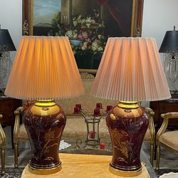 Pair of Gorgeous Vintage Bohemian Cranberry Glass & Brass Lamps in Hand-painted Gold Floral Design🌷$200Los Angeles, CA