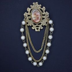 Vintage Victorian Style Cameo Brooch Pin w/ Chain Dangles Faux Pearls Gold Tone$15Wilmington, CA