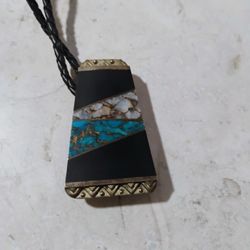 Vintage Navajo Turquoise And Onyx Mosaic And Brass Wood Shield Designer Initials On Back (SST ) 1970ssold On Auction For $439.00last Chance To Own$20Hemet, CA