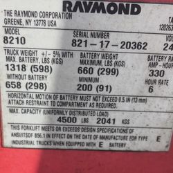 Electric Pallet Jack Raymond Model:8210 821 - 17-20362$495Moreno Valley, CA
