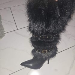 Black Faux Fur Stiletto Boots – Gold Buckle Strap Detail, Winter Glam Statement$60Menifee, CA