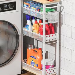 Slim Storage Cart 4 Tier Laundry Cart with Wheels, Narrow Metal Kitchen Rolling Carts Bathroom Organizers Storage Shelf with Wood Rack and Handle for $30Rialto, CA