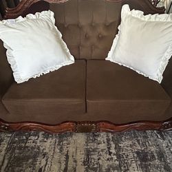 Beautiful Handcarved Wood Luxury Couch Loveseat Set Fabric Pillows Comfy Deep $4,000 Original$50Pleasanton, CA