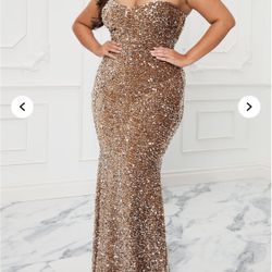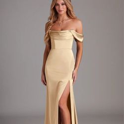 Azazie saige dress in champagne color. Sheath Off the Shoulder. Stretch Satin material. Removable sleeves.$75Union City, CA