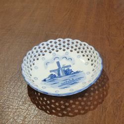 Vintage Delft Blue Holland Reticulated Porcelain Bowl 7" Windmill Scene.