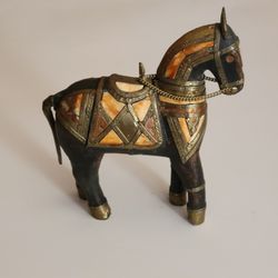 Vintage Carved Wood with Hammered Brass & Stone Inlay Armored War Horse