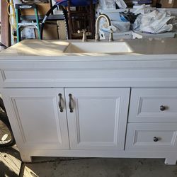 “60in White Bathroom Vanity w/ "Quartz"Top & Faucet – Like New”, OBO pricing$300Beaumont, CA