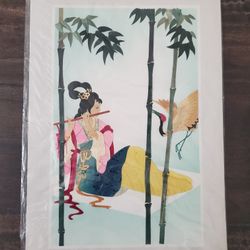 Vintage Chinese Wheat Stalk Art Woman with Flute Crane 9x11 Unframed$10Temecula, CA