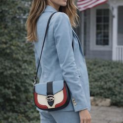 Coach colorblock crossbody purse featuring a light blue, cream, red, and navy design with silver Coach horse & carriage logo closure. Adjustable strap$189Coto De Caza, California