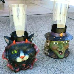 Black Cat & Grinning Witch Large Candleholders Centerpiece Rare Awesome!
