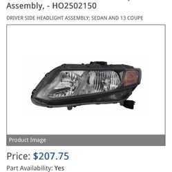 2014 Honda Civic New Headlamp Assembly, - HO(contact info removed) DRIVER SIDE HEADLIGHT ASSEMBLY; SEDAN AND 13 COUPE$260Westminster, CA