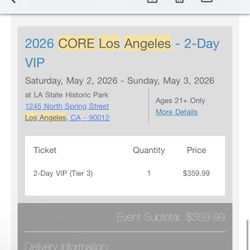 2 Tickets Core Los Angeles 2-day VIP$350Rowland Heights, CA