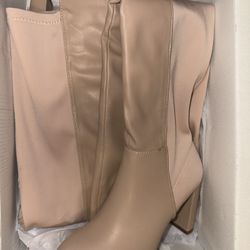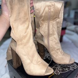 Tan suede peep toe thigh high boots with wooden heel$12Fontana, CA
