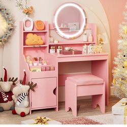 Kids Vanity with Lights, Princess Makeup Vanity Desk with Open Bookshelf, Storage Cabinet & Shelves, Toddler Vanity Table and Chair Set, Pretend Play $150San Leandro, CA