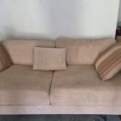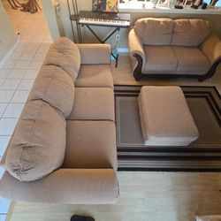Three Piece sofa set featuring Beige/tan colored textured fabric and carved ornate dark wood trim with a matching loveseat and a rectangular ottoman ($350San Diego, CA