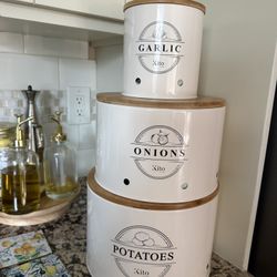 Set of ceramic kitchen canisters with wooden lids and metal latches$40Garden Grove, CA
