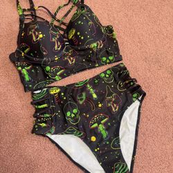New medium black trippy hippy festival rave gothic bikini outfit skull neon swim$20Upland, CA