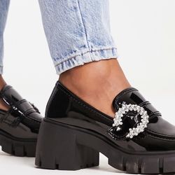 Steve Madden Hailey Chunky Heel Black vegan Patent Bling Buckle $10Los Angeles, CA