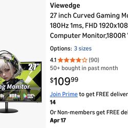 Viewedge 27 inch Curved Gaming Monitor 180Hz 1ms, FHD 1920x1080P Computer Monitor,1800R VA Screen, 120% sRGB with FreeSync, Low Motion Blur, HDMI & DP$80Corona, CA