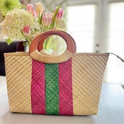 **Handmade Woven Straw Tote Bag with Colorful Stripes** $45Montclair, CA