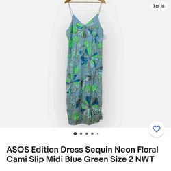 ASOS Edition Dress Sequin Neon Floral Cami Slip Midi Blue Green Size$40Corona, CA