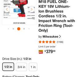 Milwaukee M18 1/2 Impact (Tool Only)$300Los Angeles, CA