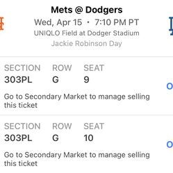 Dodgers Mets 4/15 Tickets (2) Jersey Giveaway$150Fillmore, CA