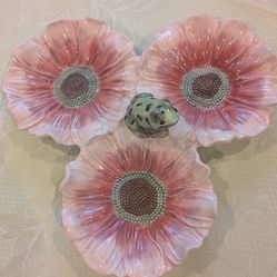 Rare CR Figural Floral Divided Serving Dish: 3 PINK FLOWERS Green Frog •$90Simi Valley, CA