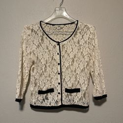 ISSI, Women Ivory Lace Black Trim Button Front Cardigan, Size M$15Naval Air Station Point Mugu, CA