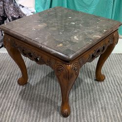 Side/ End Table Features A Brown Granite Top Set On A Carved Wooden Base With Ornate Legs.$75Thousand Palms, CA