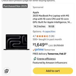Apple 2025 MacBook Pro Laptop with M5 chip with 10‑core CPU and 10‑core GPU: Built for Apple Intelligence, 14.2-inch Liquid Retina XDR Display, 16GB U$1,200Indio, CA