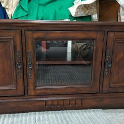 Entertainment Credenza With A Dark Chestnut Finish And Beveled Glass Door.$125Thousand Palms, CA