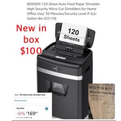 New in box BONSEN 120-Sheet Auto Feed Paper Shredder High Security Micro Cut Shredders for Home Office Use/ 30 Minutes/Security Level P-4,6-$100$100Palmdale, CA