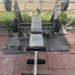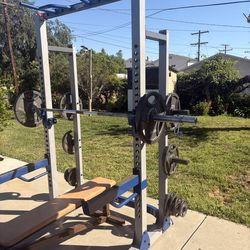 Fitness gear half rack with bench and 300 pounds Olympic weights set in clouding 45 pounds bar$599Lake View Terrace, CA