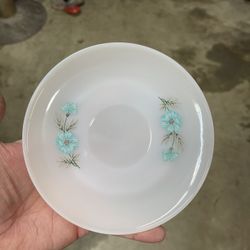 Fire-King milk glass saucer in the Bonnie Blue pattern, featuring blue carnation flowers. Brand: Anchor Hocking (Fire-King). Pattern: Bonnie Blue (Ca$8Quartz Hill, CA
