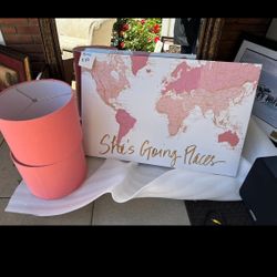 World Map Canvas And 2 Coral/pink Lamp Shades$50Arcadia, CA