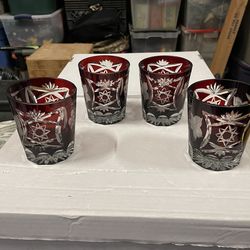 Set of 4 vintage Bohemian ruby red cut-to-clear crystal whiskey glasses, possibly from the Ajka Marsala pattern. They feature heavy, detailed hand-cu$30Quartz Hill, CA