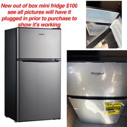 New see all pictures whirlpool mini fridge new out of box $100 firm pick up east Palmdale will have plugged in ready to do it works prior to buying c$100Palmdale, CA