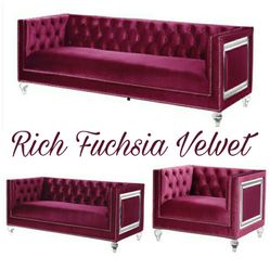 Fuchsia Velvet Deep Tufting Acrylic Legs Mirrored Accent 3 Piece Set Firm Price $3,100 Financing Available $3,100Irwindale, CA